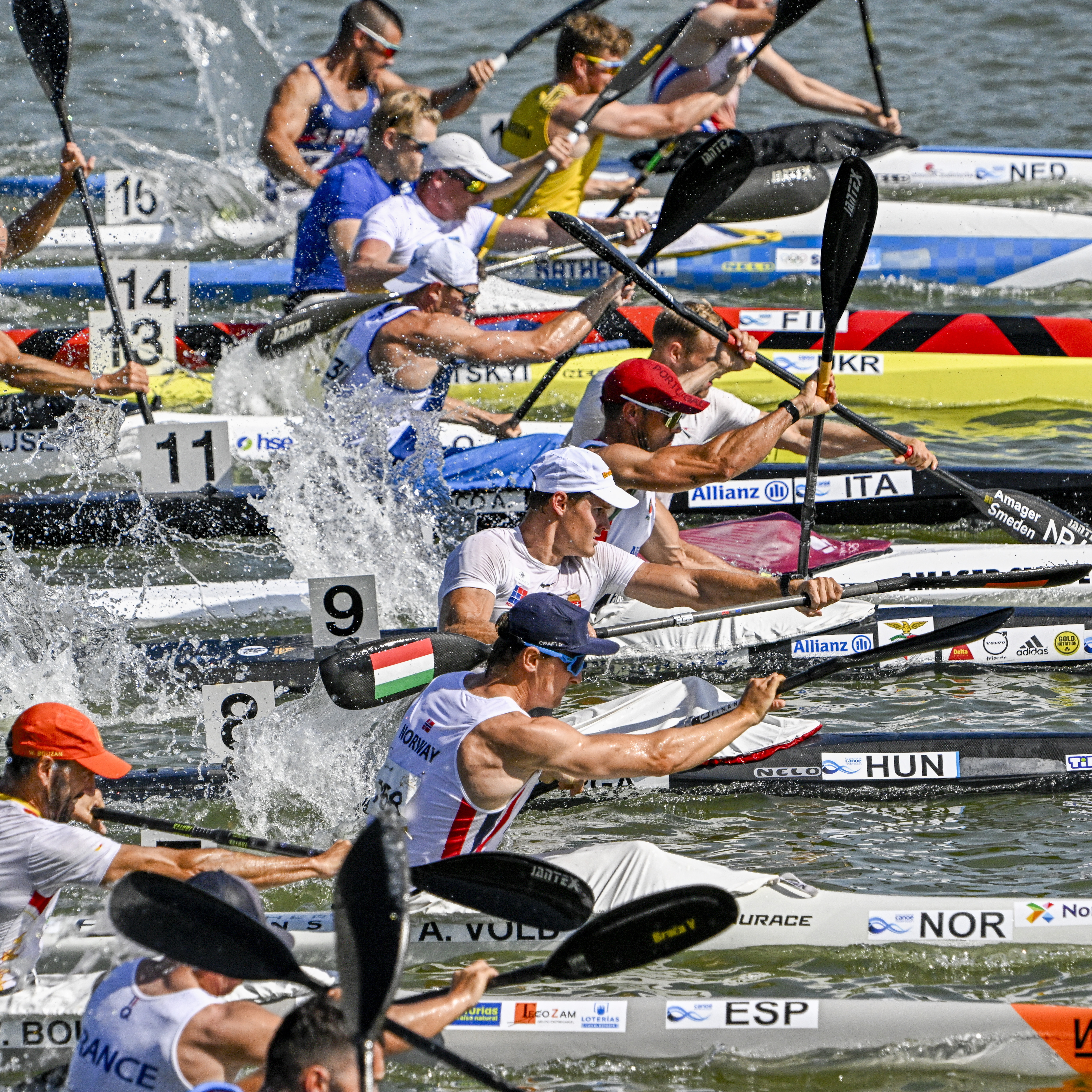 A későbbi második helyezett Varga Ádám (alulról az ötödik) a kajak-kenu Európa-bajnokság férfi kajak egyes 5000 méteres számának döntőjében a csehországi Racicében 2025. június 22-én. MTI/Szigetváry Zsolt