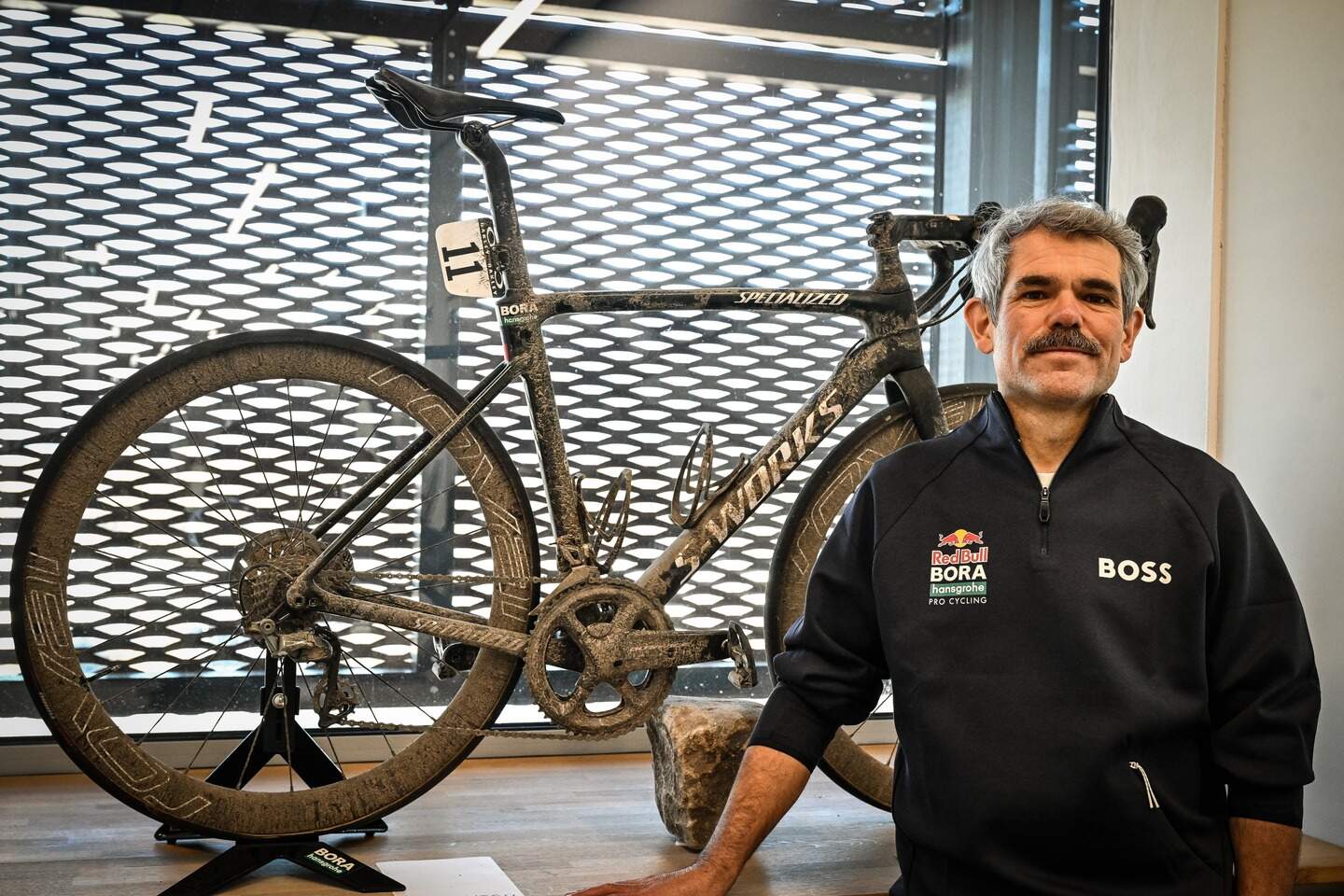 A kiállítás belül is folytatódik. A lépcsőházban hatalmas fotó látható Jordi Meeusról, amikor 2023-ban megnyerte a sprintet a Champs-Élysées-n. A folyosó végén találjuk azt a kerékpárt, amellyel Sagan az utolsó Paris-Roubaix-ját teljesítette. A Speci még mindig tiszta sár. Nem véletlenül áll ott a felirat: "Ne nyúlj hozzá!"