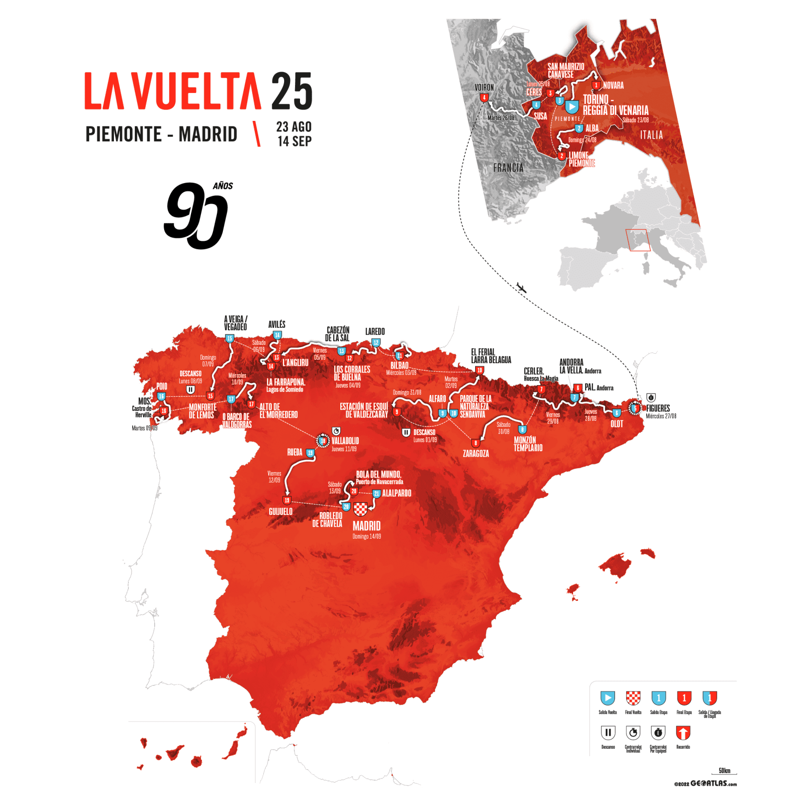 Nagy rajt Torinóban, összesen három szakasz Olaszországban, hegyi befutó már a második napon, összesen két időfutam, melyek közül az első csapatidőfutam lesz, és legjobb esetben öt (de inkább négy) olyan szakasz, ami mezőnyhajrát hozhat. Ahogy azt megszokhattuk, a Vuelta nem a sprinterek versenye, idén összesen tíz hegyi befutós szakasz került be az útvonalba.