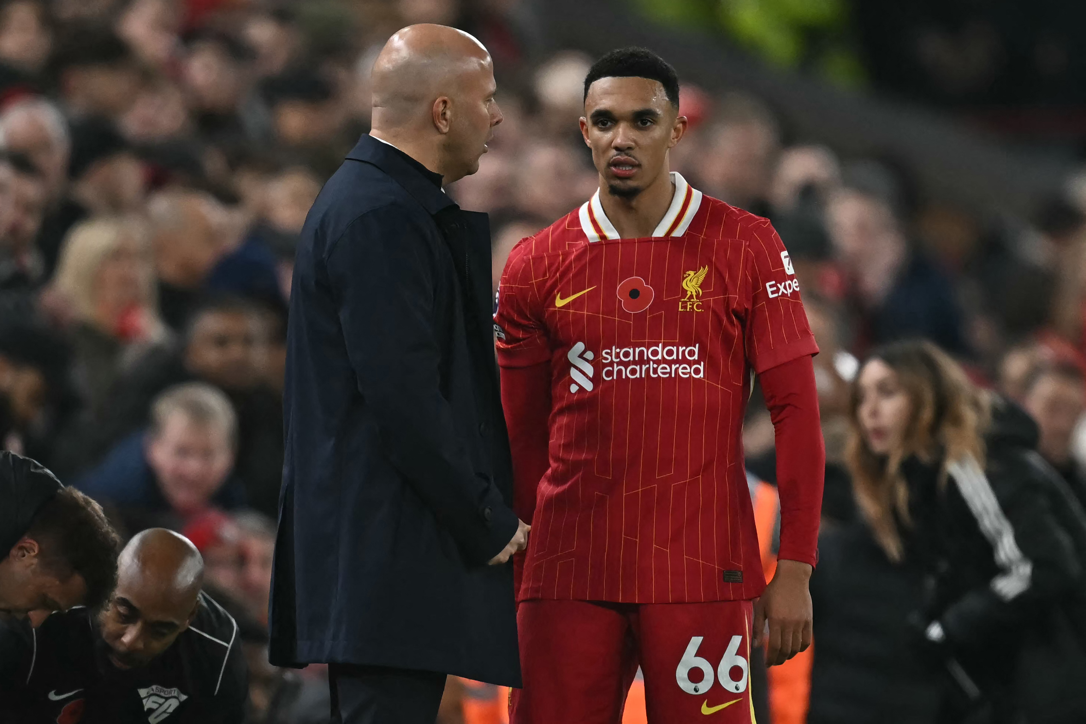 Liverpool's Dutch manager Arne Slot (L) speaks with Liverpool's English defender #66 Trent Alexander-Arnold (R) after he leaves the game injured